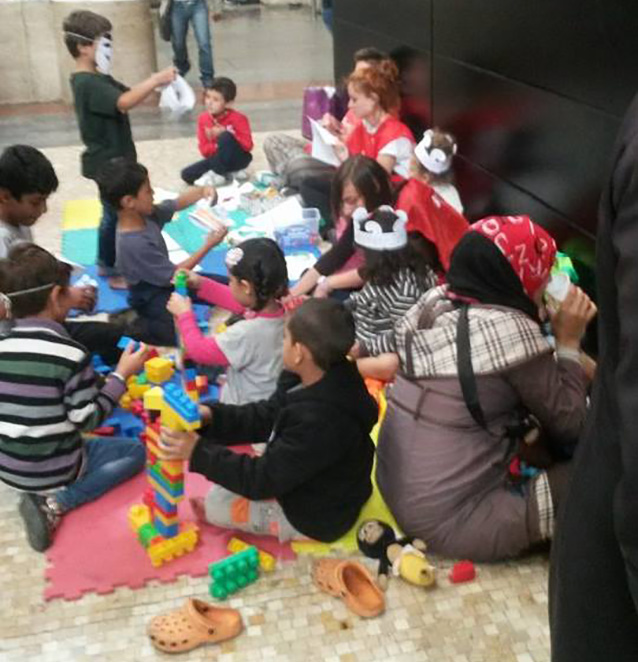 Foto del presidio di volontari che a Milano assistono i bambini siriani.